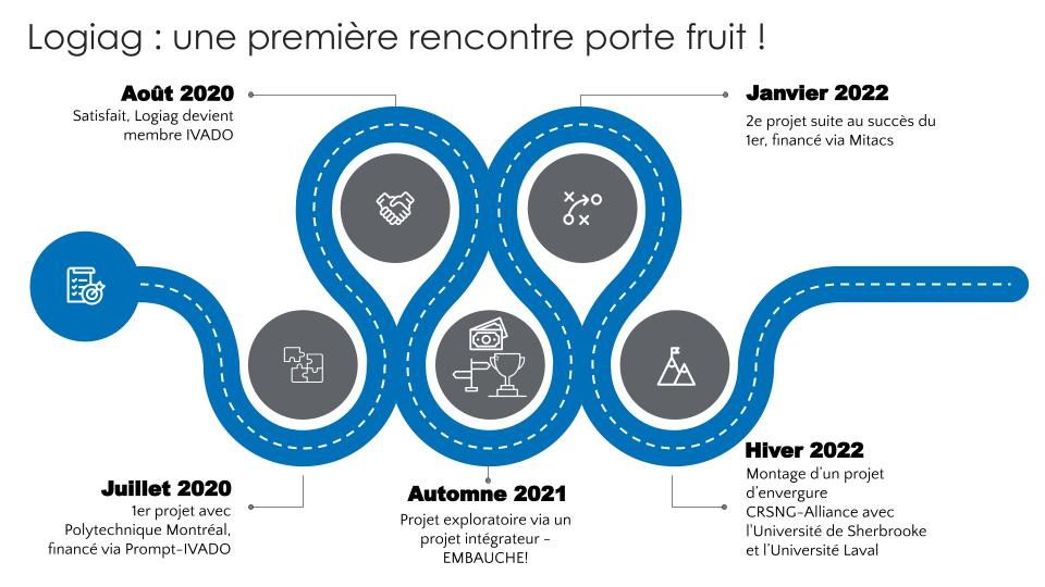Logiag a par la suite confirmé son intérêt à s’engager dans cette voie, ce qui a permis au conseiller IVADO et à professeur Agard d’amorcer un montage financier alliant un financement provincial (PROMPT) ainsi qu’un financement fédéral (bourse de démarrage IVADO).